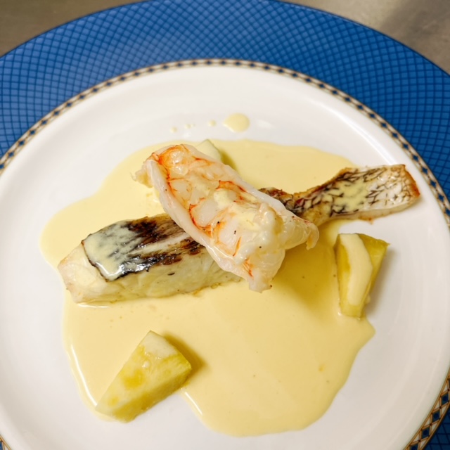 真鯛と赤エビのポワレ・白ワイン風味のサフランソース
